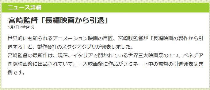 宮崎監督「長編映画から引退」