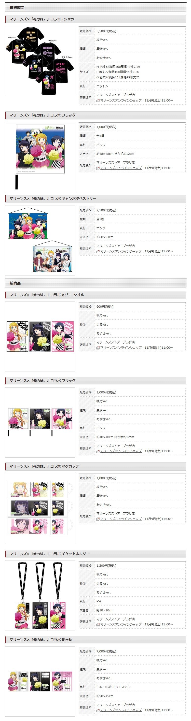 今年10月に発売し、大好評頂いた大人気アニメ「俺の妹がこんなに可愛いわけがない。」とのコラボグッズに5種類の新アイテムを加え、11月9日より第2弾を発売致します。