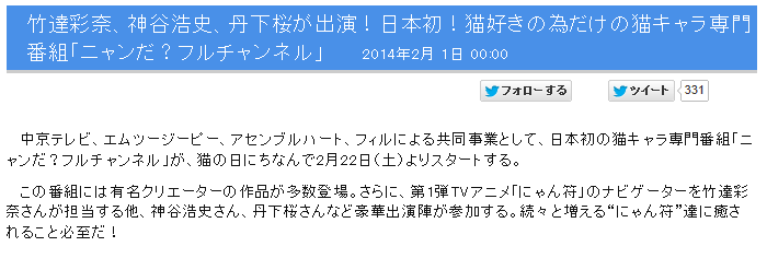 引用元: 【テレビ】猫キャラ専門番組「ニャンだ?フルチャンネル」、中京テレビで2月22日から毎日放送 第1弾アニメ「にゃん符」ナビ:竹達彩奈