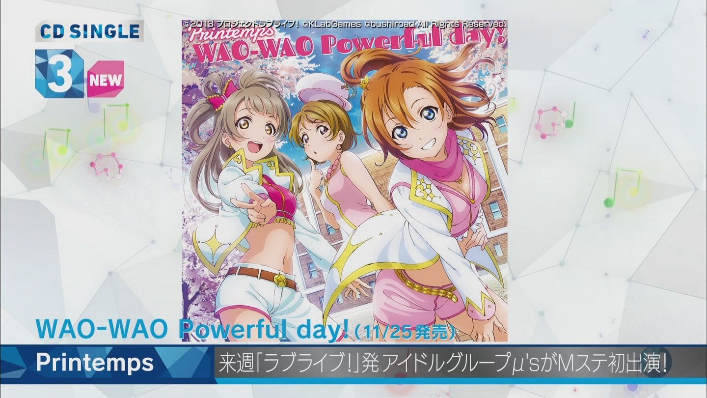 来週12月4日(金)20:00からテレビ朝日系列で放送される音楽番組「ミュージックステーション」に、『ラブライブ!』μ’sが初登場!今年を象徴するアーティスト第9位に選ばれた模様です。またMステランキングでは、Printemps新曲「WAO-WAO Powerful day!」が3位にランクインしました。