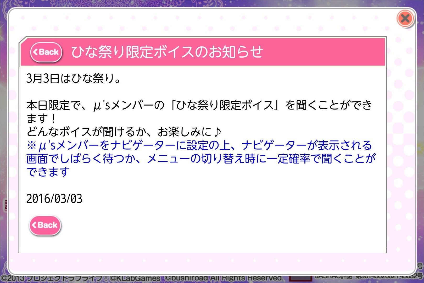 『ラブライブ!スクールアイドルフェスティバル(スクフェス)』では、本日限定でμ'sメンバーの「ひな祭り限定ボイス」を聞くことができます!
